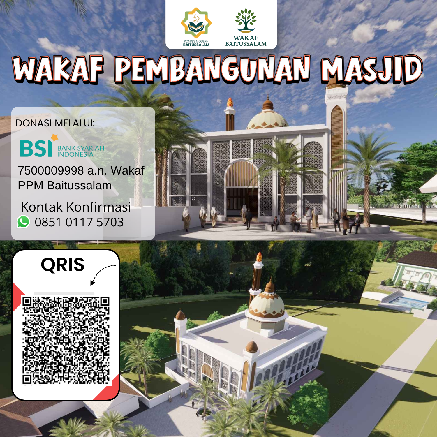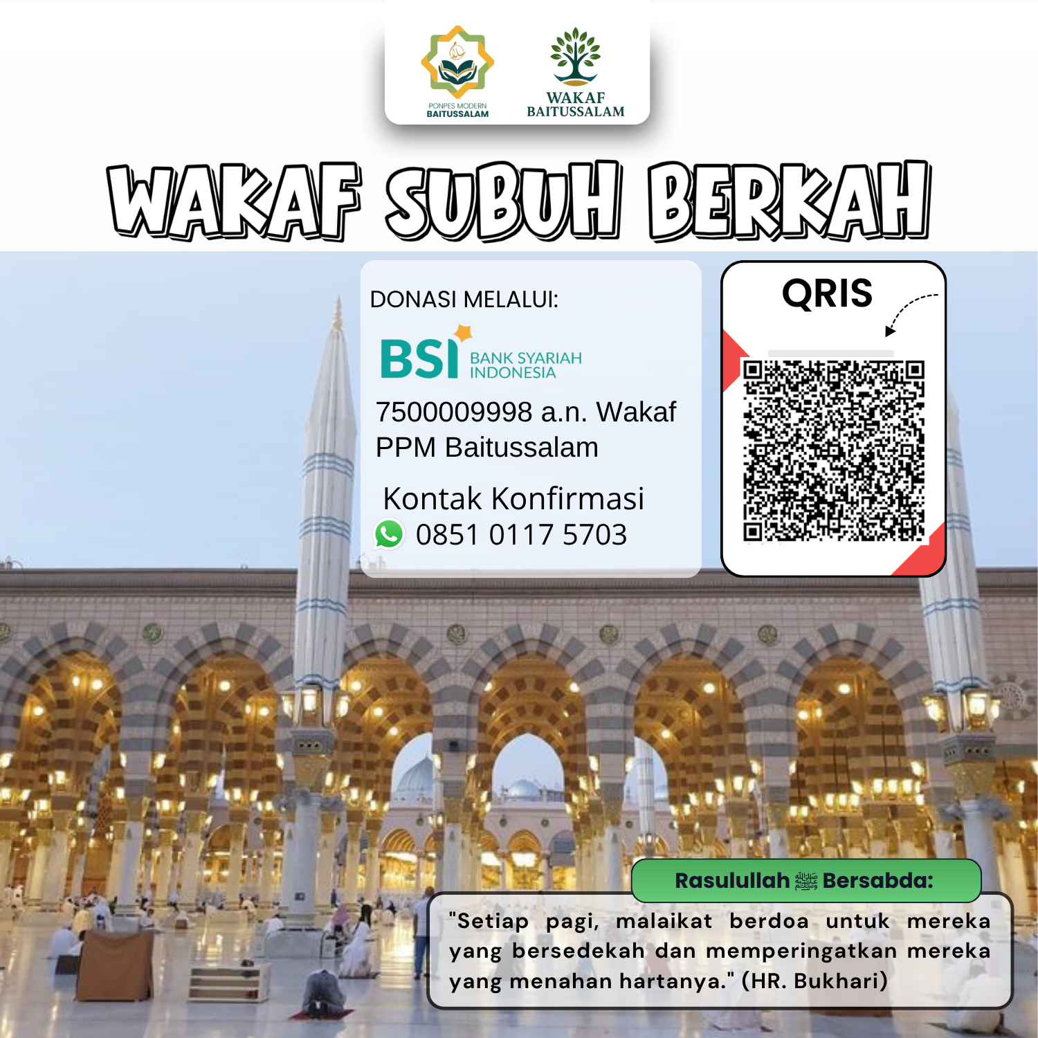 Lembaga wakaf resmi di bawah naungan Pondok Pesantren Modern Baitussalam. Mengelola dan menyalurkan wakaf untuk pembangunan masjid, pendidikan, dan fasilitas umat secara transparan, amanah, dan berkelanjutan.